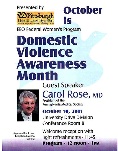 To observe October 2001 Domestic Violence Awareness Month, the VA Federal Women's Program hosted Dr. Carol Rose, who spoke on this important topic.